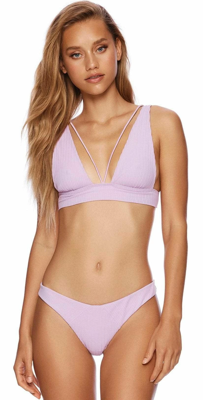 The Beach Bunny Larson High Apex Bikini Top in Lavender features a soft, lightweight, ribbed fabric. This top offers adjustable over the shoulder straps and ties at the mid back. Pair this top with your favorite bottom from the Lavender Collection.