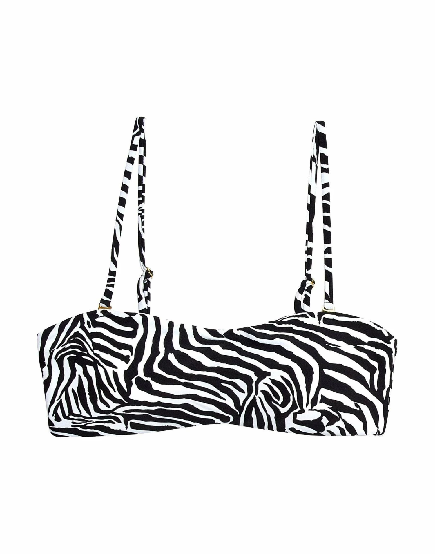 The Beach Bunny London Bralette Bikini Top in Zebra features pullover design with removable/adjustable straps. This top pairs perfectly with the Chrissy Micro Tango Bottom.