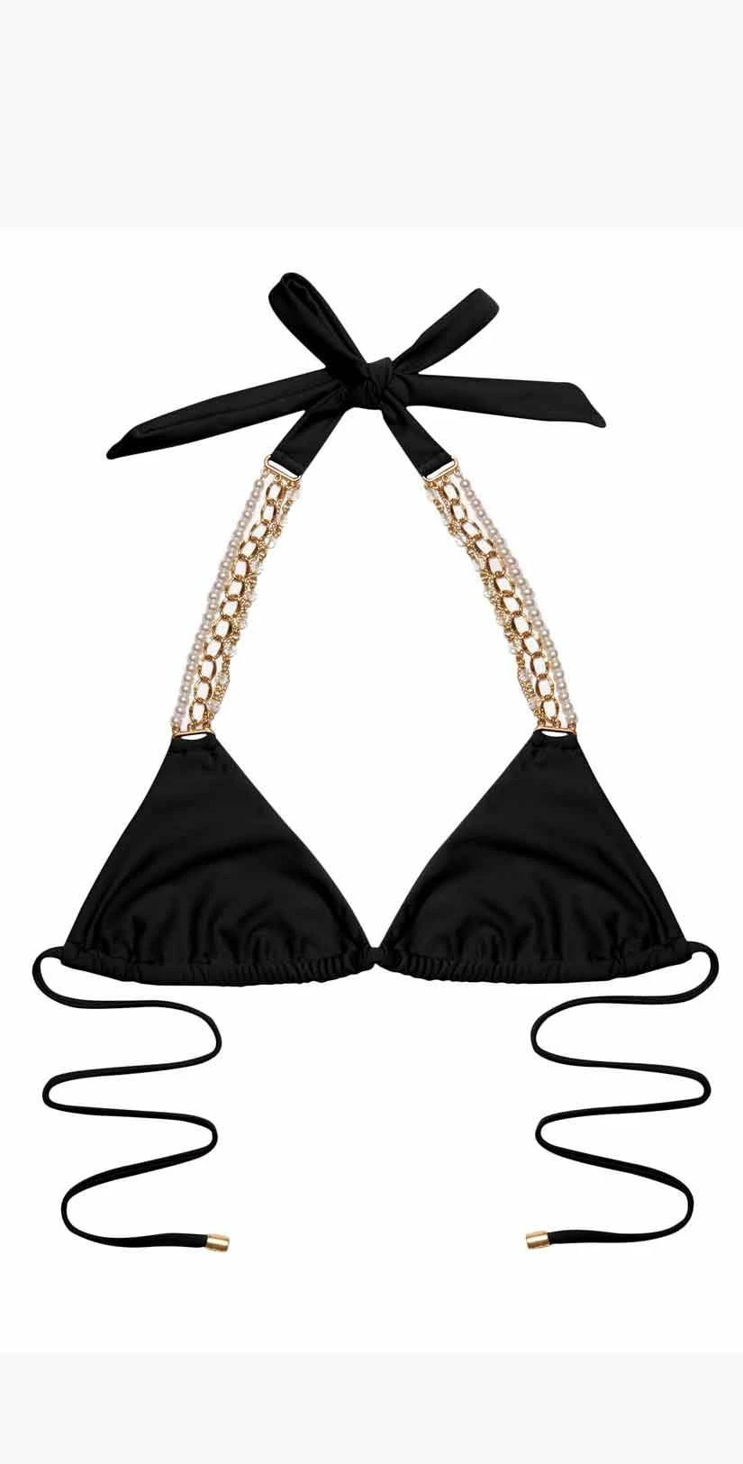 The Beach Bunny Pretty In Pearls Tri Top In Black or Poppy is a perfect bikini top with pearl detail at halter top. Your next statement piece, the Pretty In Pearls bikini.