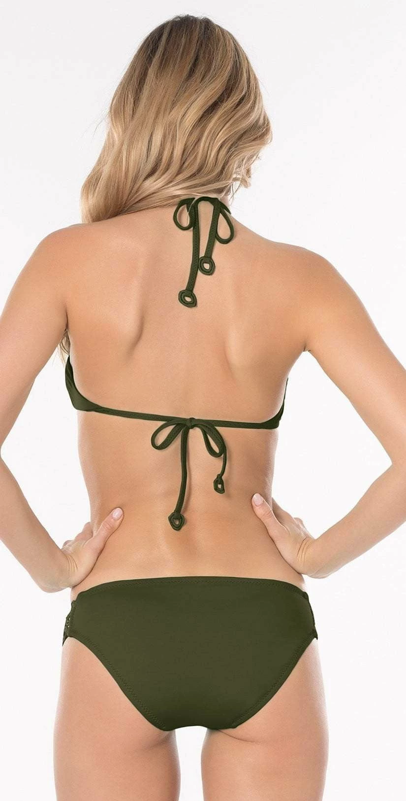 The Becca Siren Halter Top in Bayleaf features a stylish ringlet detail along the trim. The halter top offers removable cups and ties at the neck and back. Get the matching bottoms here.
