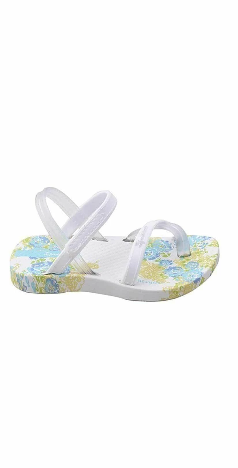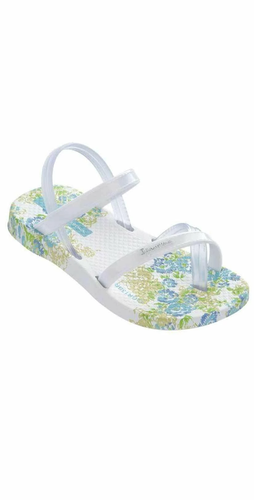 The Ipanema Baby Blanket White Sandals are cute white and blue floral patterned flip flops with velcro side strap and clear heel strap.
