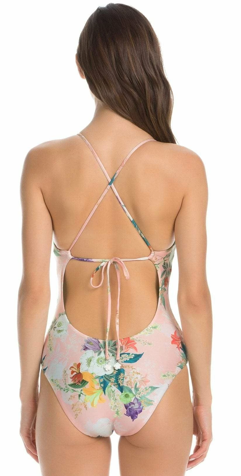 The Isabella Rose Blossoms One Piece is an all over pink floral one piece with a plunging v-neck front, criss cross back straps, a low scoop back, soft removable cups and adorable pink pom pom trim. This is a dainty, flirty and sexy one piece!