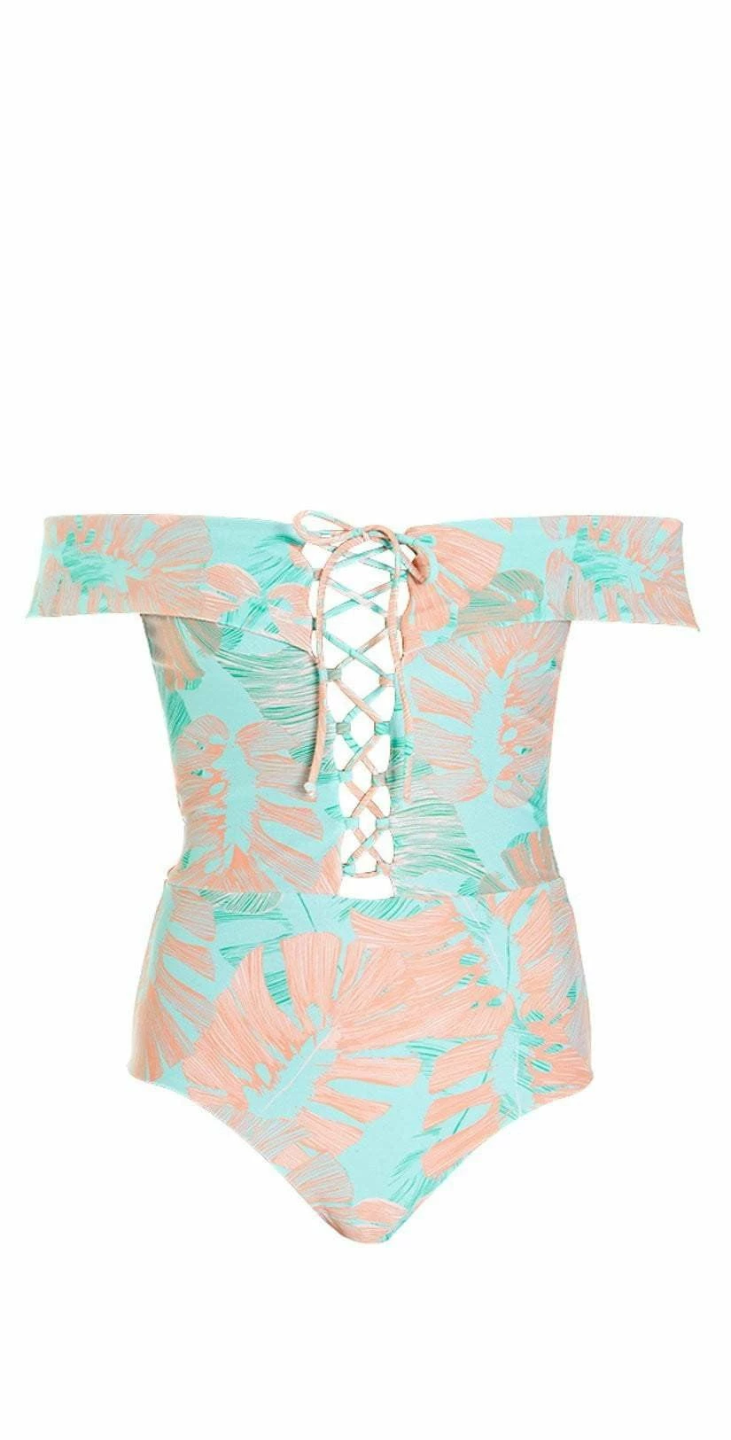 The L Space Anja One Piece in Bungalow Palm is a pastel printed One Piece featuring a deep plunge, lace-up design that ties in the center. This super adorable suit features an off the shoulder look with fold over details and a sexy high thigh.