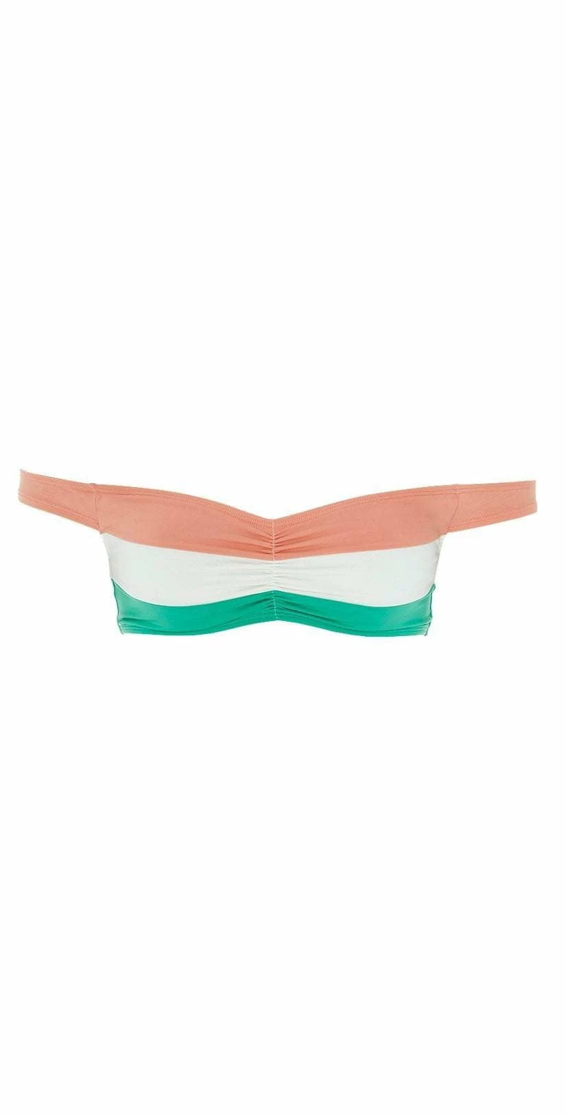 The L Space Color Block Ziggy Top in Spearmint is an off the shoulder bandeau top with a green, peach and cream color block design and a cinched middle to give it a flirty look. Features a no metal, hook or tie design for that cozy pullover style, pairs so perfect with the Veronica Bitsy Bottom!