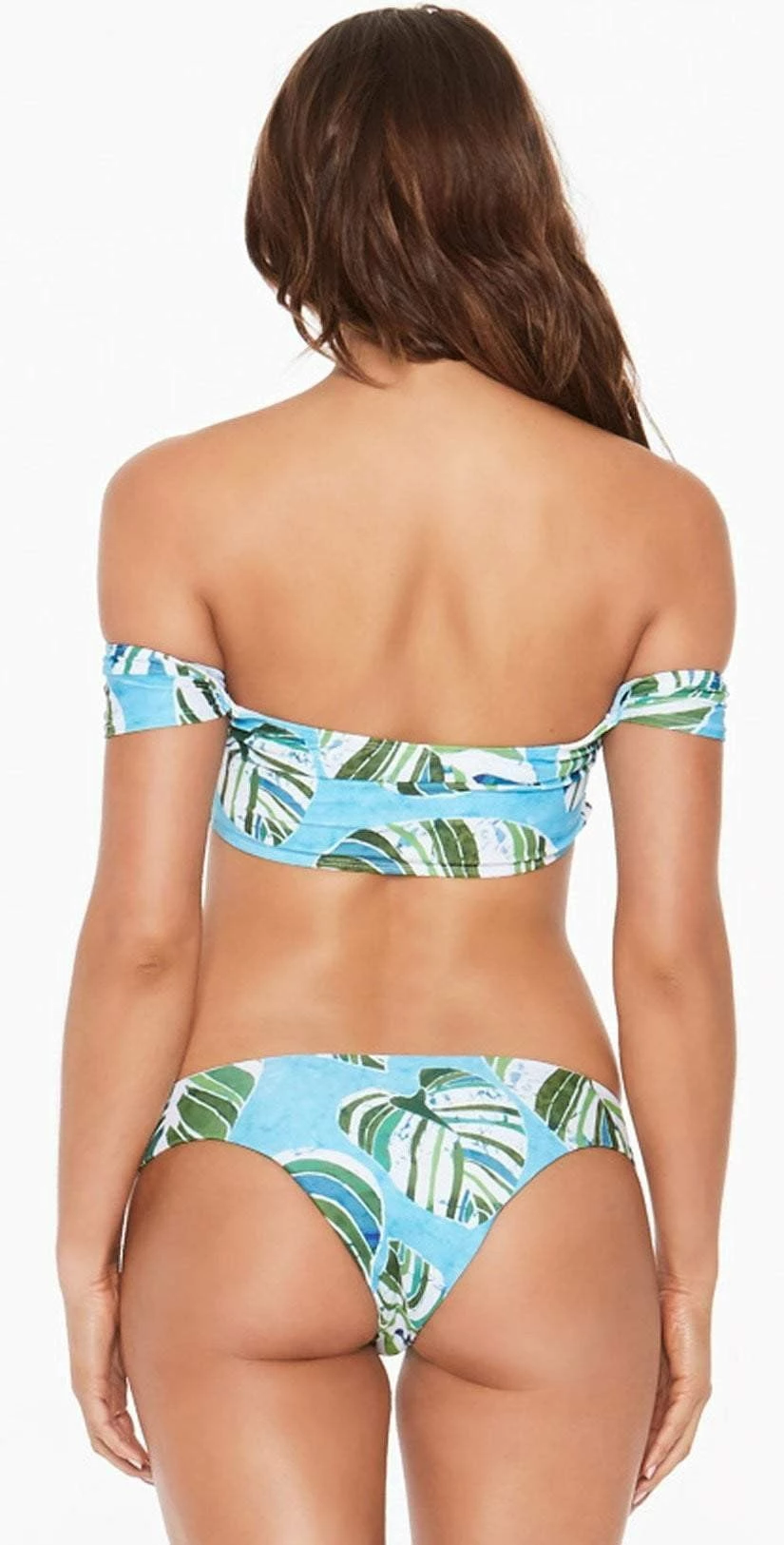 The Dixie Top by L Space offers a gorgeous turquoise palm print with an off the shoulder look. This top is convertible! Wear it with the sexy lace-up detail in the front, or turn it around and have it in the back. Pairs with the L Space Sandy Bottom in White.