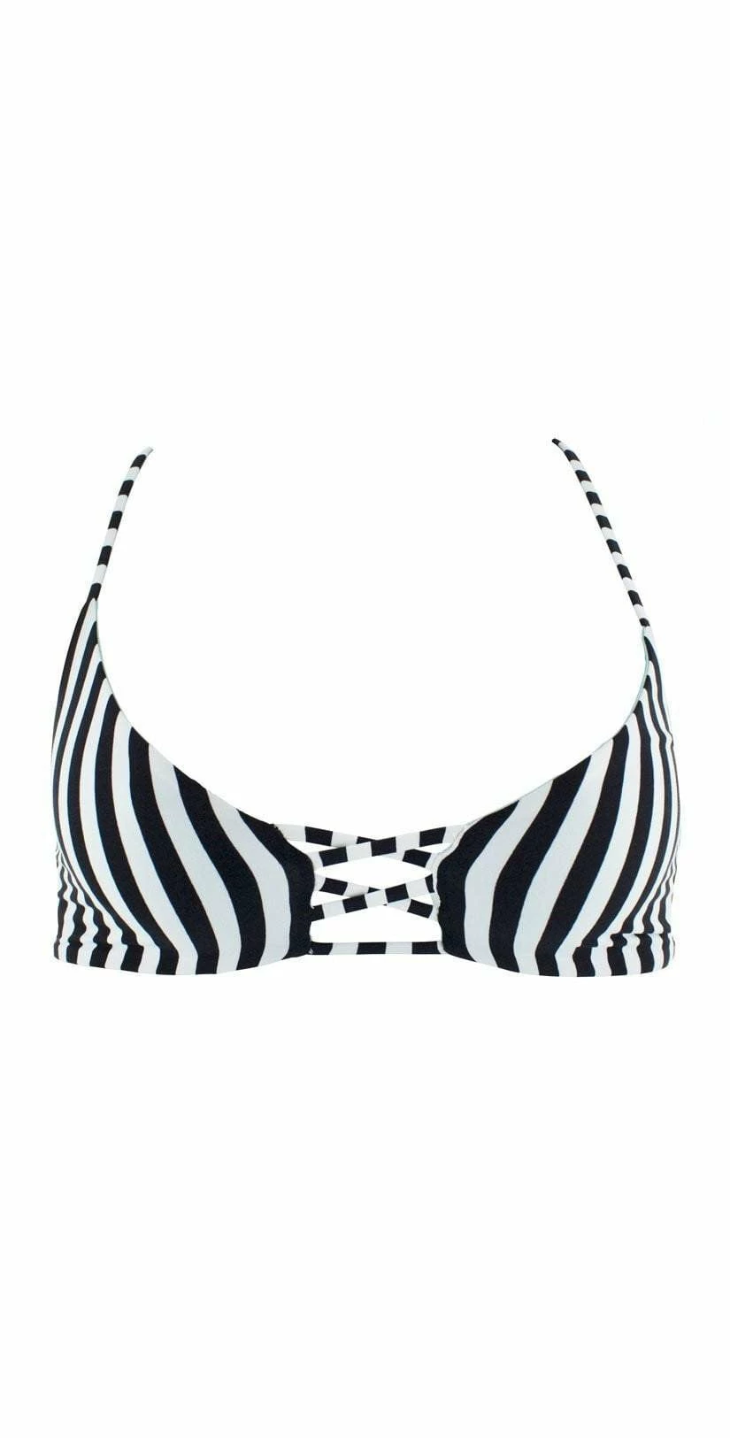 The L Space Flynne Reversible Domino Stripe top is a bralette-style top that reverses from a black and white stripe design to a solid turquoise with sexy striped straps that crisscross at the bust and tie in back. Pairs perfectly with the High Waist Domino Bottom!