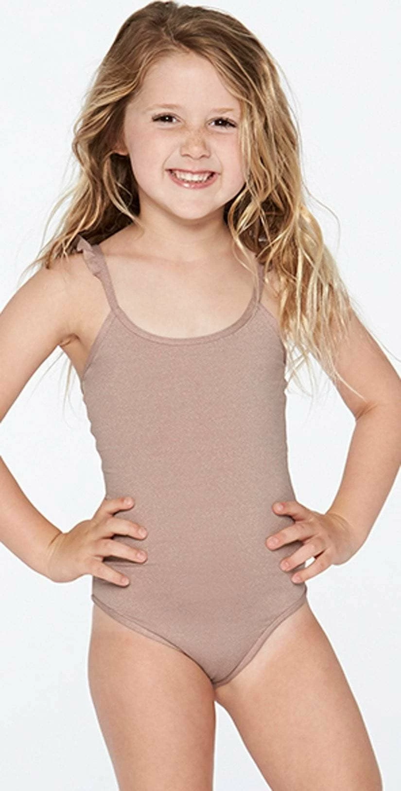 The L Space Girls Katie Shimmer One Piece in Dusty Pearl features a shimmery fabric that will make your little princess feel special! This one piece offers a slim ruffle detail on the adjustable shoulder strap and full bottom coverage.