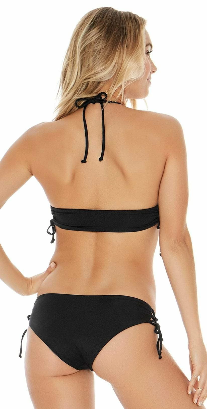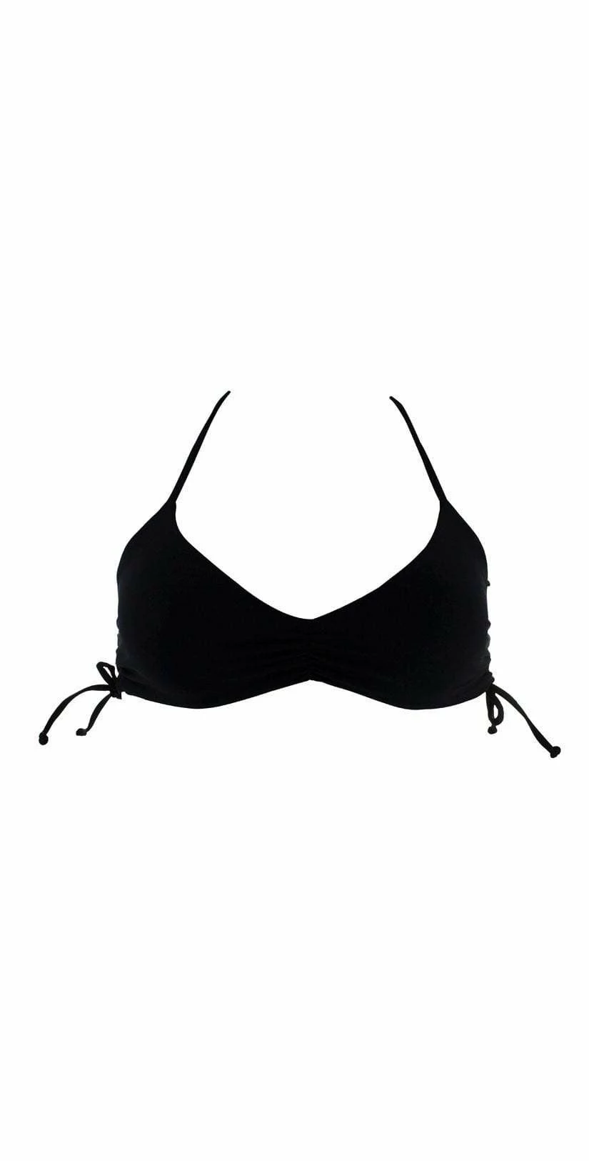 The L Space Gwen Top In Black is a bralette-style top with sexy side lace-up details that are adjustable. This super sporty top is a pullover style with a ruched v neck that ties at the neck and pairs with the matching L Space Ella bottoms.