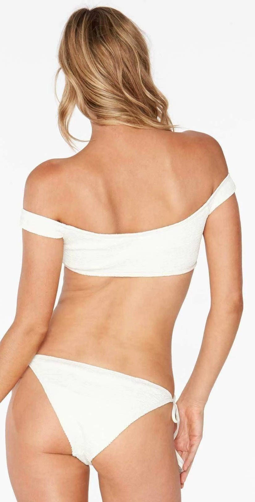The L Space Pucker Up Lily Bottom in Cream features a crinkle, textured fabric for a twist on the classic tie side bottom. This bottom offers tie sides for an adjustable fit and moderate coverage. Pair with the matching L Space Pucker Up Ziggy Top.