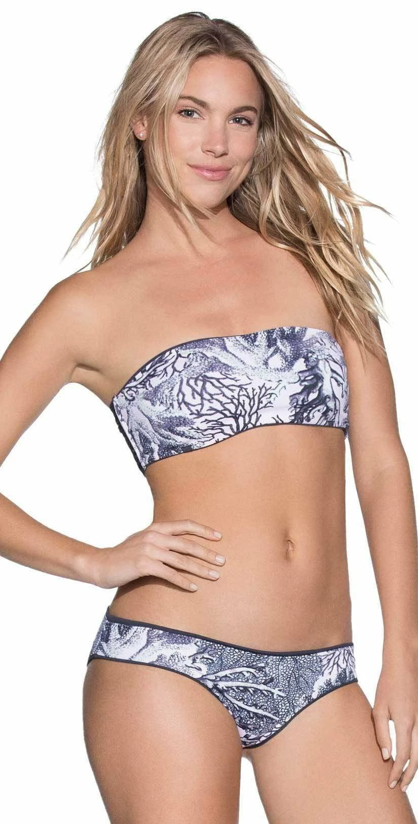 The Maaji Moonless Night Bandeau Top is a navy blue bandeau top that can be worn with a keyhole in the front or back. Reverses to a reef pattern. This top offers side boning for added support and comes with adjustable, removable straps. Pair with the matching Maaji Moonless Night Sublime Bottom.