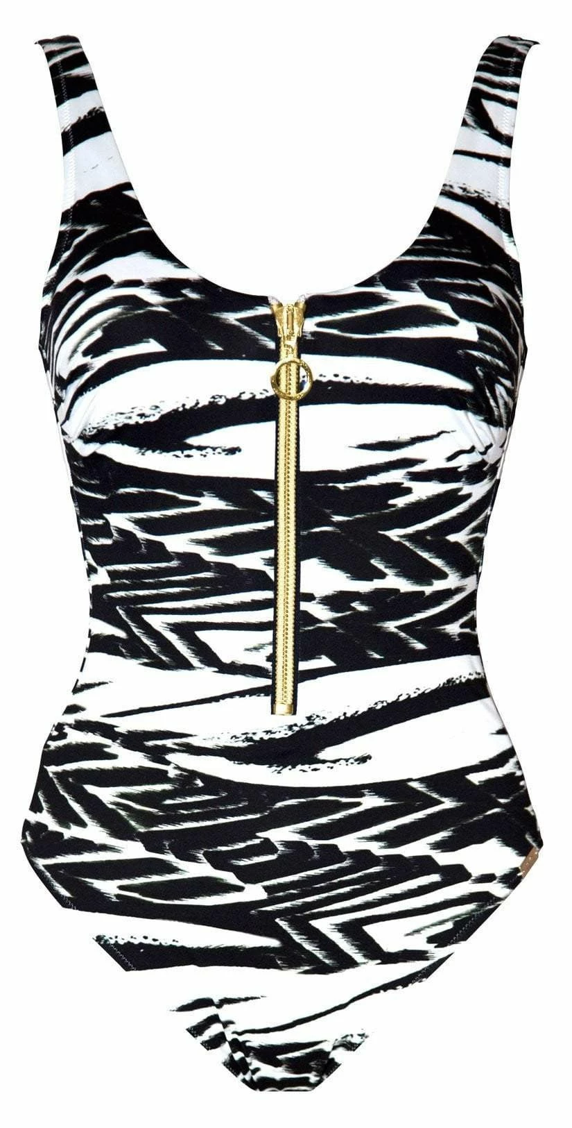 The Maryan Mehlhorn Safari Zip Front Swimsuit offers a sporty look with a graphic safari print. This one piece is fully lined, has a scoop neck and a functioning zipper in front. This suit offers full bottom coverage.