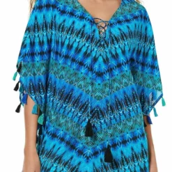 The Miraclesuit Cabana Chic Caftan is a pull over caftan with a lace up front detail. This caftan is chic and comfortable. Pair with the matching Cabana Chic Blue Peephole Tankini Top.