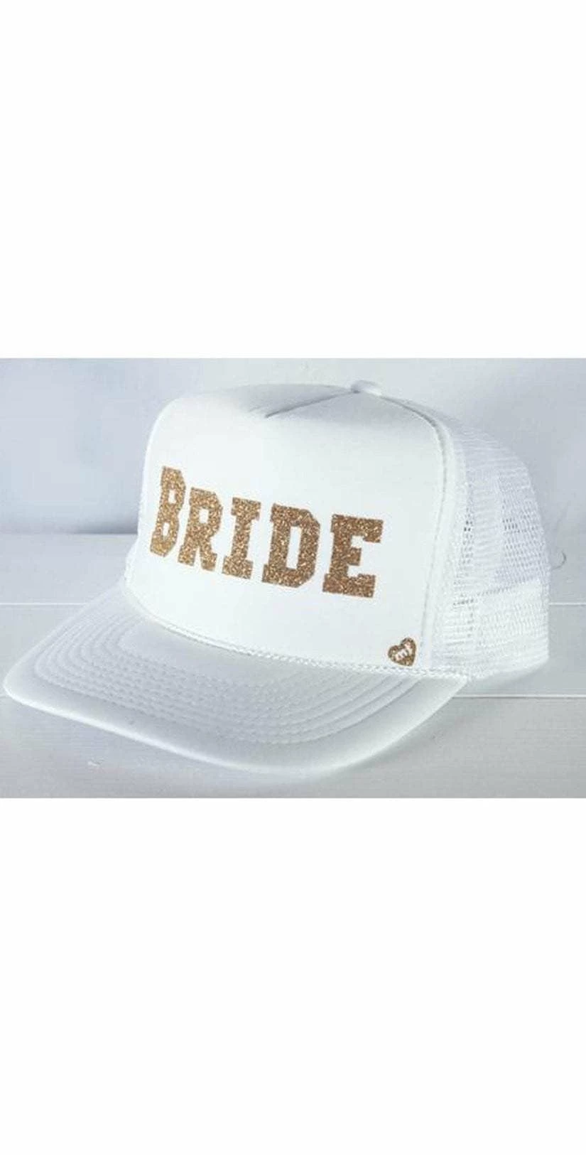 - White mesh with gold glitter lettering of „BRIDE“ on front