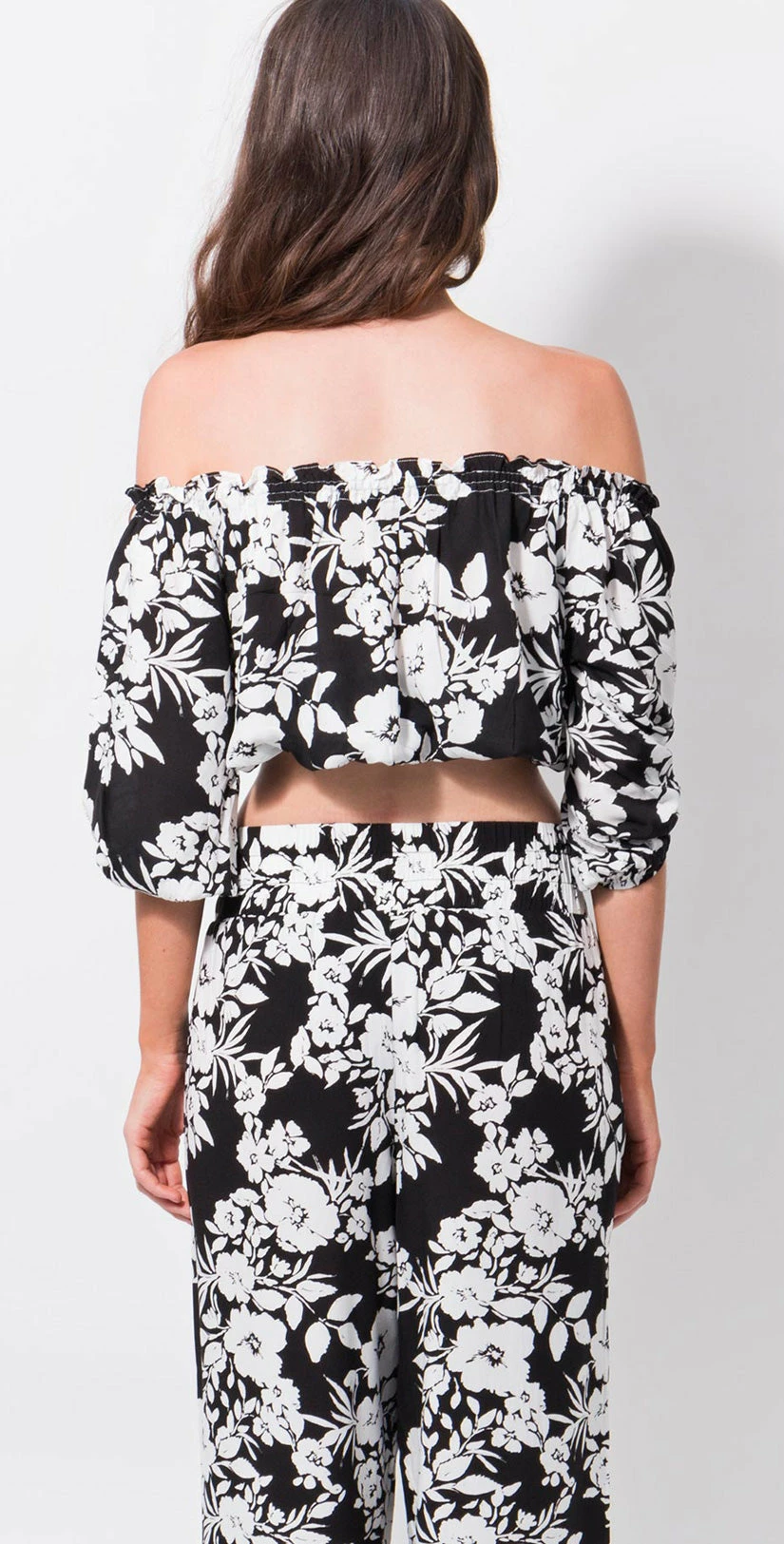 The Pia Rossini Monterosa Top features a black and white floral print, off the shoulder, crop style top. This top is perfectly paired with the Pia Rossini Monterosa Pants!