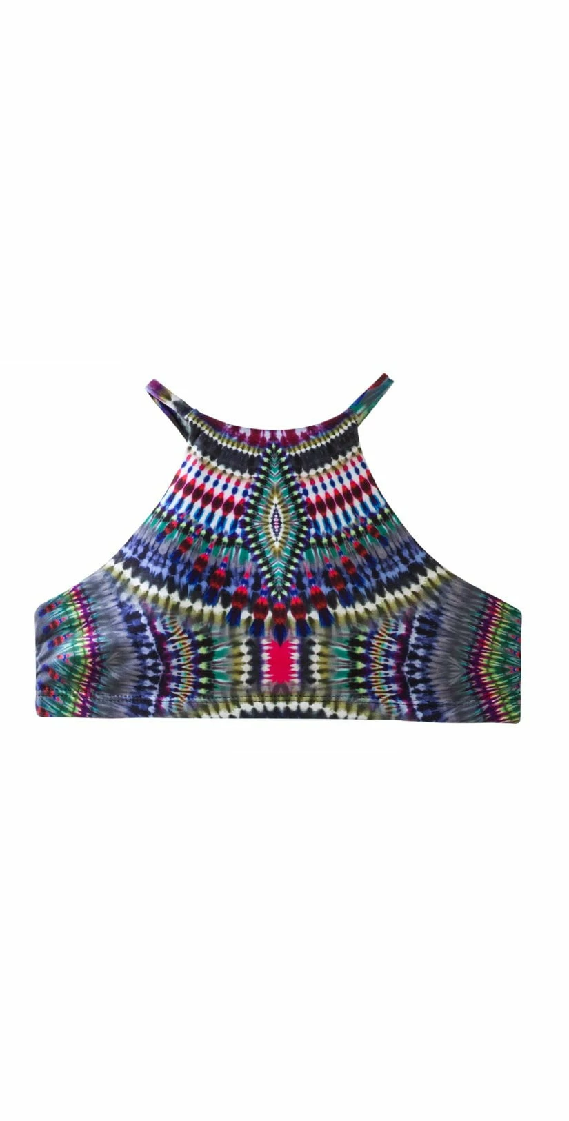 The PilyQ Nile Hudson High Neck Top is a colorful patterned high-neck top that ties at the back for the perfect fit. This stylish top offers soft cups and pairs with the PilyQ Nile Basic Full Reversible Bottom.