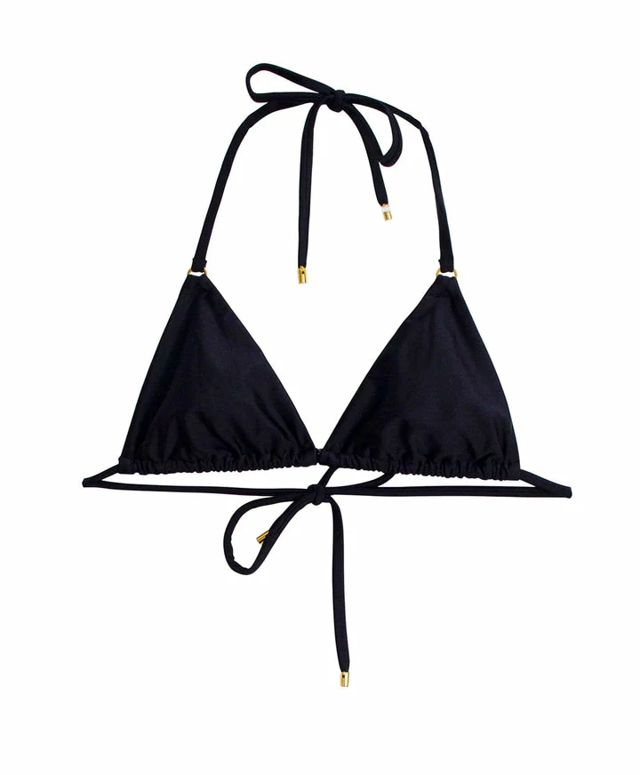 A PQ Swim classic tri top with gold detailing. Comes with removable padding and pairs beautifully with the PQ Swim Black Pier River Tie bottoms.