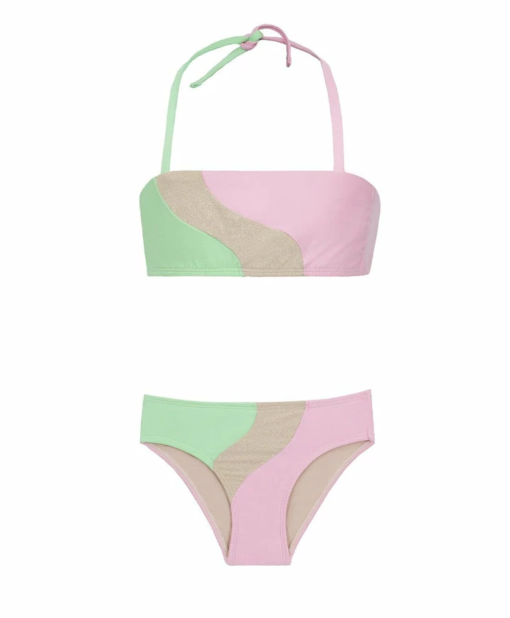 A beautiful bandeau style two piece with color block detailing. Your daughter will be comfortable all day in this set. If unsure of what size to pick, size up!