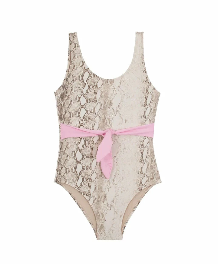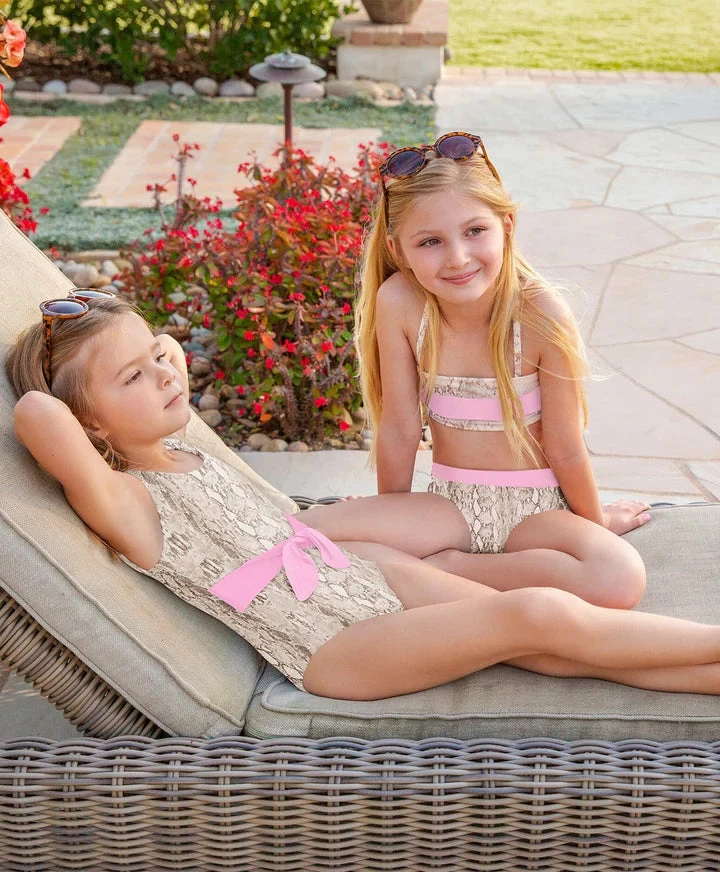 A comfortable one piece for your daughter. Featured in Kaa and we added a light pink bow for some extra cuteness. If unsure about what size to pick, size up. Moms can match their daughters in one of our Kaa suits for adults!