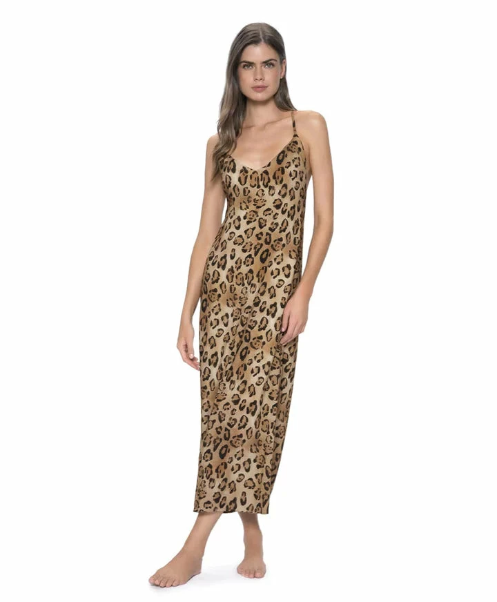 A classic midi length slip dress in Leopard. Features crossed straps that can be tied to your liking.