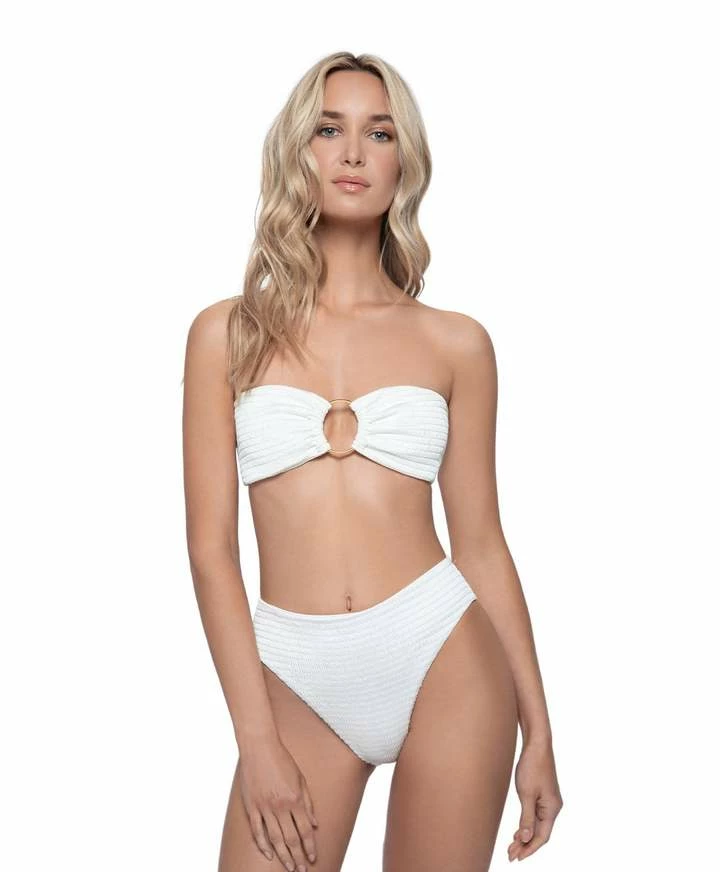 This adorable bandeau features a gold ring, detailed fabric, and a tie closure for an adjustable fit. We love this top paired with the PQ Swim Pure High Waist bottoms. Features removable padding and straps.