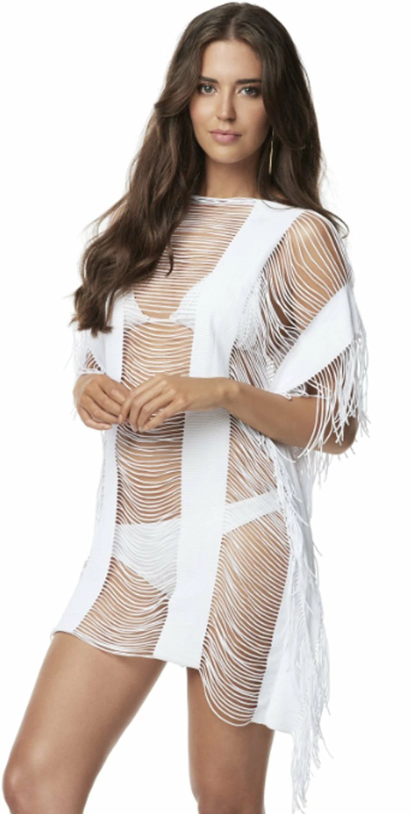 This PilyQ Water Lilly Monique Cover Up in White is chic and daring with sexy shirred cut out details throughout for hints of skin and a fringe bottom hemline. This cover-up will look gorgeous over any PilyQ suit!