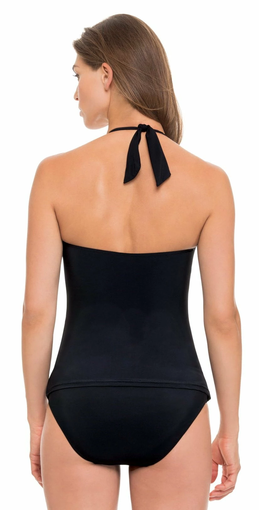 The Profile By Gottex Hollywood Black Tankini Top is an all black tankini top that has white piping below the bust for contrast and style. This top pairs great with the Profile by Gottex black bottoms.