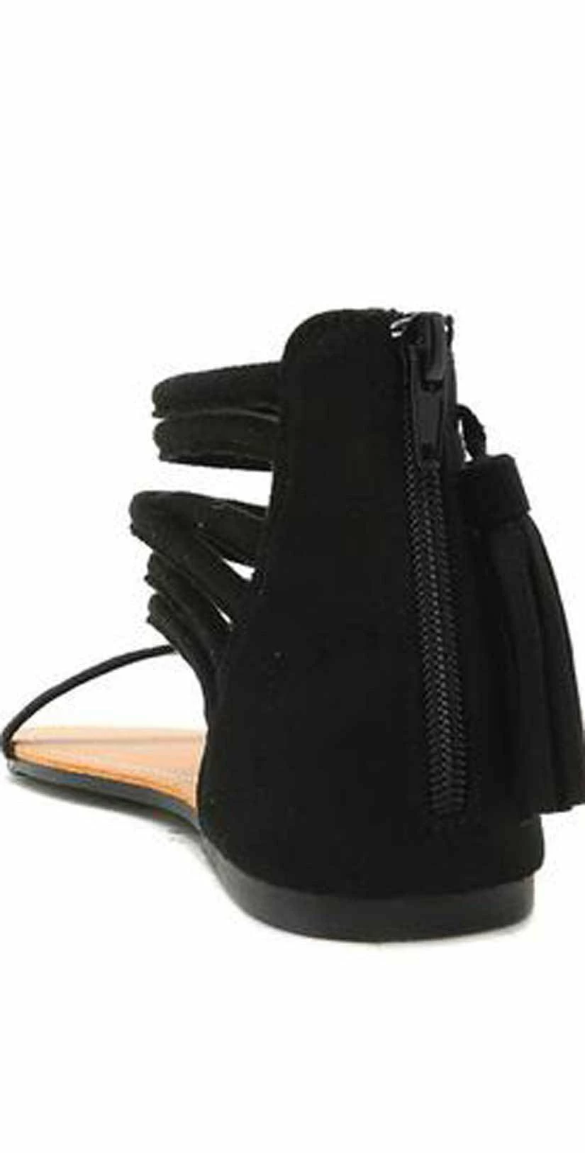 The Qupid Shoes Archer Black Stretch Suede Sandal in black is a multi banded sandal with tassel detail that zips in the back. This black sandal is perfect for a date night or a night out on the town and black goes with everything!