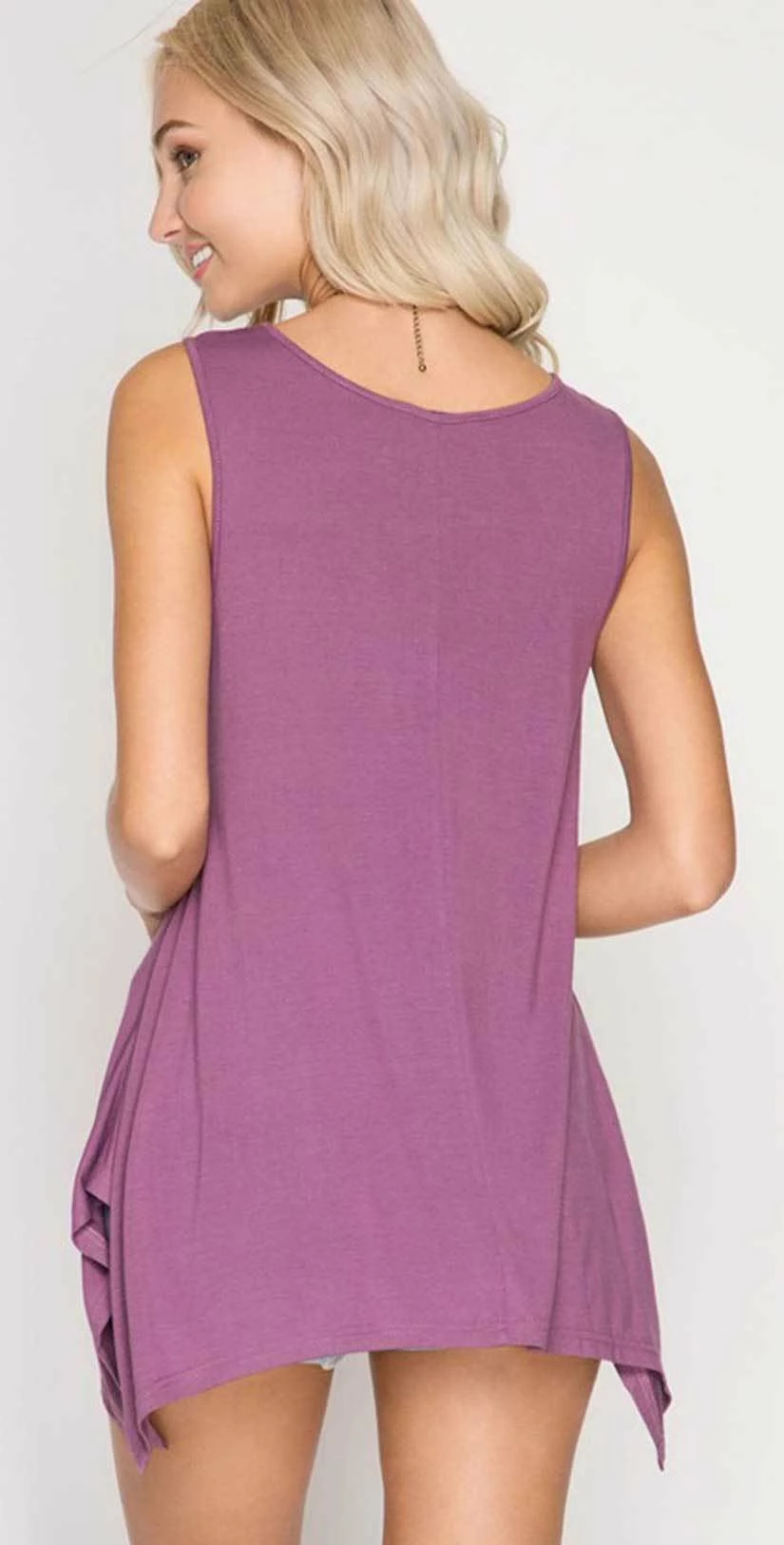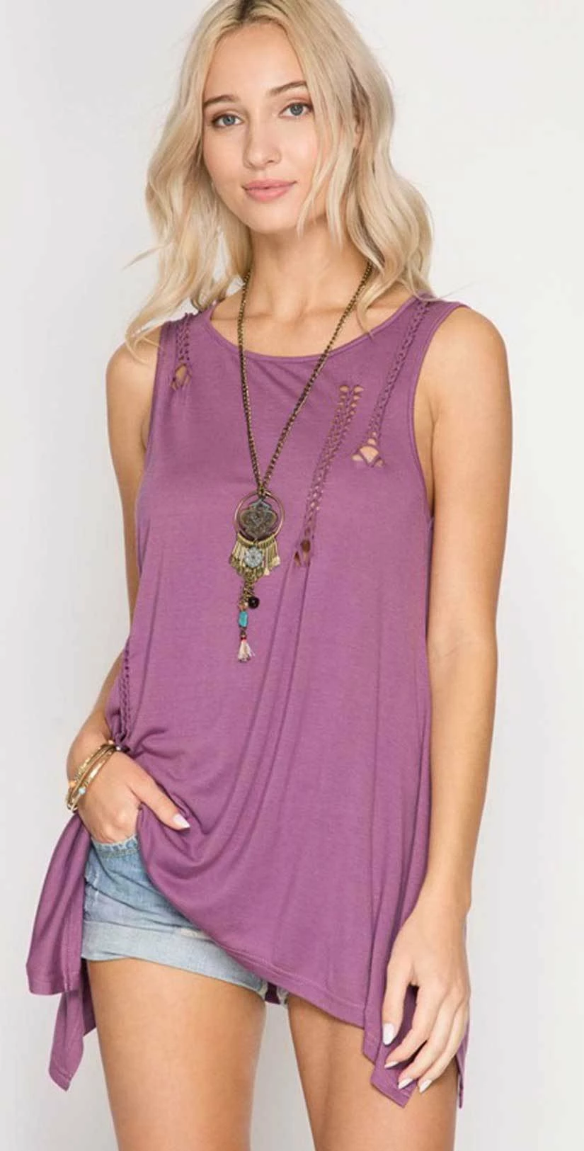 The She + Sky Sleeveless Top with Braided Cutout Detail is a mauve top with cuts out that are braided and has a high low hem. The shirt is perfectly paired with white jeans or with cut off short s to wear down to the beach.
