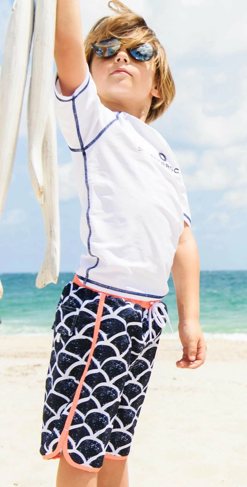 The Snapperrock Boys St Barths Board Short in Navy features a beachy wave print with neon coral piping. These shorts offer a comfortable elastic waistband with a drawstring tie and a mesh liner. Pair with any boys Snapperrock Rashguard Top.
