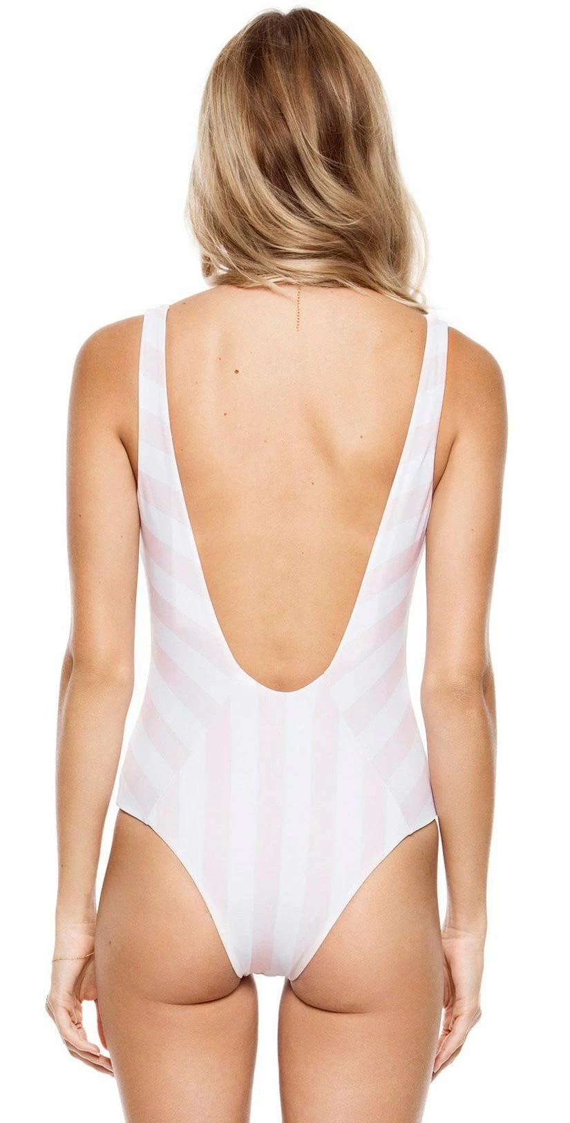 The Tori Praver Genevie One Piece Swimsuit is a blush and white chevron striped one piece with a scoop neck, no cups, a low scoop back and cheeky bottom coverage.