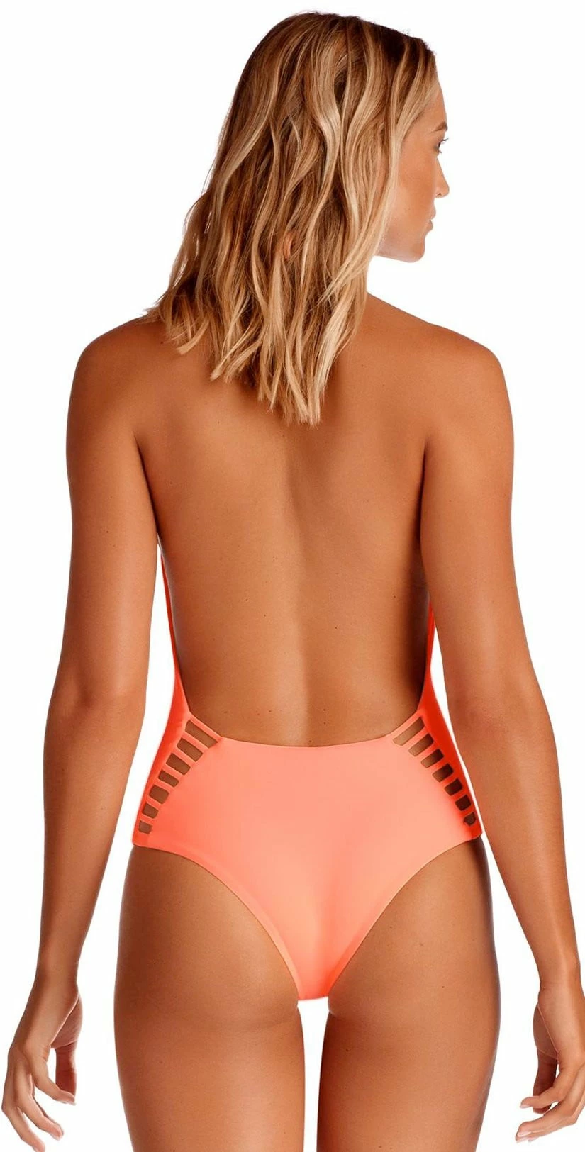 The Vitamin A EcoLux Bianca One Piece Bodysuit in Peach features a plunging V front with ties at the neck. This suit has a low, open back with cut out detail at the hips and cheeky to moderate coverage.