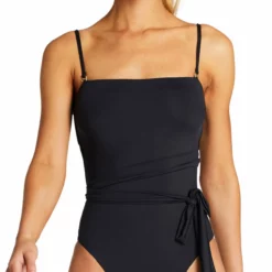 This Vitamin A EcoLux Marylyn One Piece Swimsuit features a bandeau top with removable straps, and a supportive shelf bra. This suit comes with a removable wrap tie at the waist, and a medium high cut leg with moderate to cheeky coverage. This suit is made from a superfine matte jersey fabric with superior stretch, made in the USA from recycled nylon fiber.
